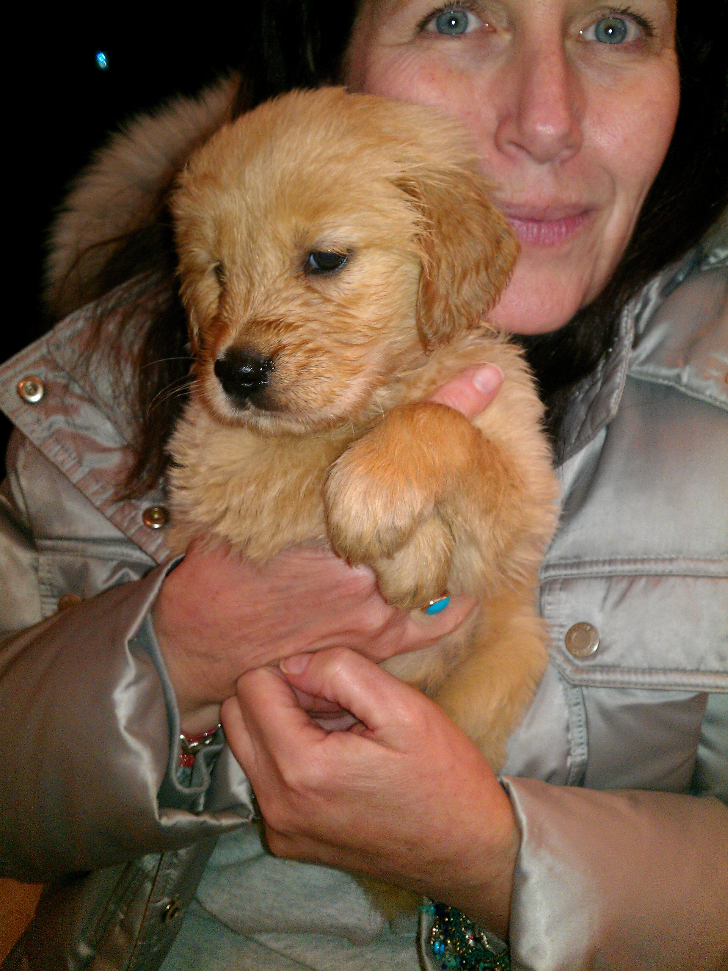 So is was good medicine for my husband that we went to the breeder right from the hospital to see our new little Golden Girl.  The last time we were there, she was only a few days old and didn’t really have that “steal your heart” face that puppies have.  She sure does now.  My husband melted when he saw her.  He snuggled her and kissed her nose and told her that she was going to be a much loved dog.  The smile on his face was a welcome sight.  Lisa, our breeder, said we can take her home in two weeks.