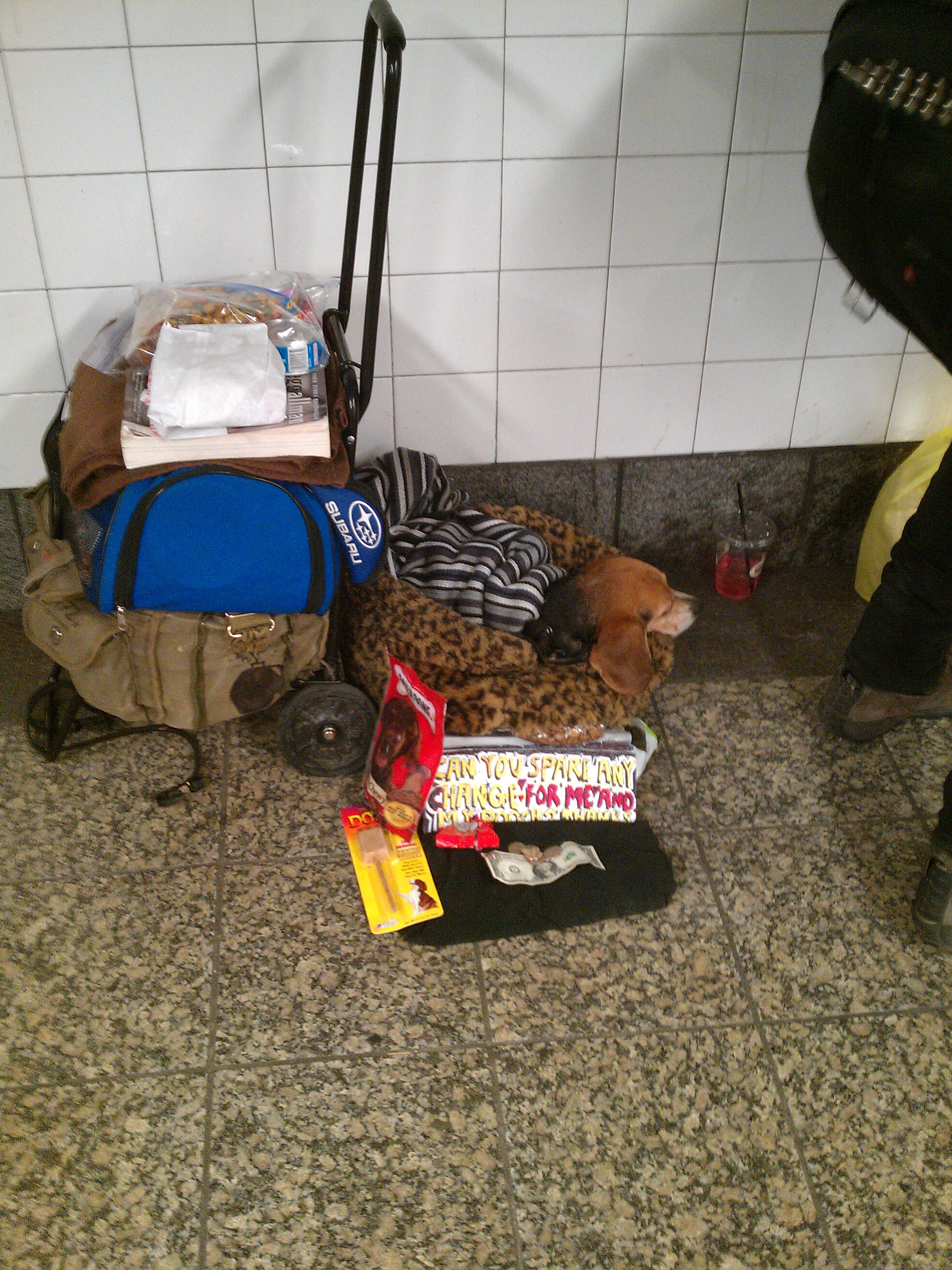 So why have I begun looking for Will everyday just so I can give him a dollar? I know his name is Will because I asked him. Am I nuts talking to this guy! Everybody knows you don’t engage these people in conversation. But something about him makes me want to say “Good morning. How are you today?” Maybe it’s the way he sits quietly with his back against the subway tiles, his luggage wheels with all his stuff next to him. Maybe it’s because he smiles and says “I’m doin’ OK. Thanks.” Maybe it’s because he has a friendly conversation with a number of commuters who stop to speak with him everyday. Maybe it’s the little beagle he has with him and the way he has her bundled up in a dog bed with a blanket to keep her warm.