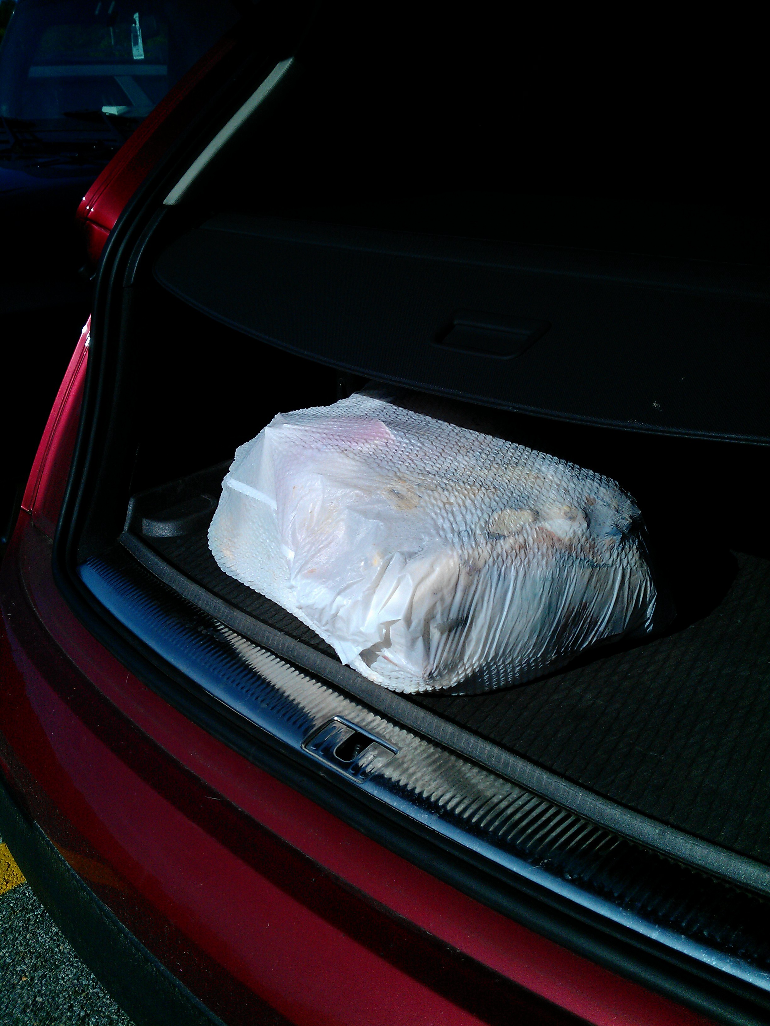 Friday is garbage day. On Thursday night, I walk the trash can down to the bottom of the driveway so I don’t have to do it in the morning. Then, in the morning, I drop the last bag of garbage in on my way to work. As I pulled into the parking lot at the train station, happy and singing along with the radio, a picture popped into my head. It was not the picture of me dropping a bag, a particularly wet, smelly bag of garbage into the trash can at the end of the driveway. No, it was a picture of that same bag lurking in the dark, distant way-back of my SUV. My SUV that will sit parked uncovered for 12 hours in the station parking lot.