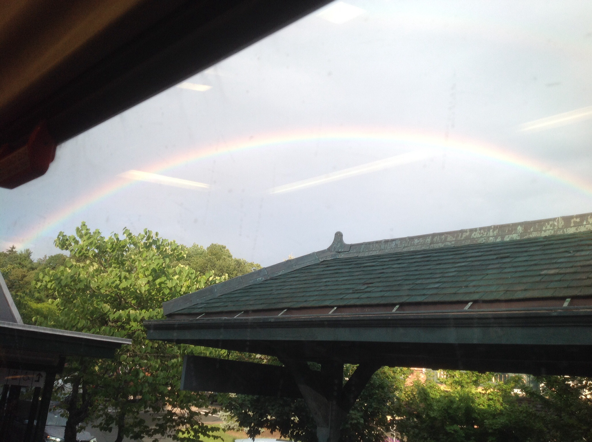 I’ve always believed in signs.  As I was pondering all this, I looked out the train window and saw the most beautiful rainbow I have ever seen. ( I prefer the Italian word arcobaleno – rainbow just doesn’t capture the majesty of it.) It was a full arch, spanning the entire sky.  The colors were bright and solid, right out of a child’s box of crayons.  As I watched, a lighter, ghost version appeared over it.  These words came to me “I have set my rainbow in the sky as a sign…”