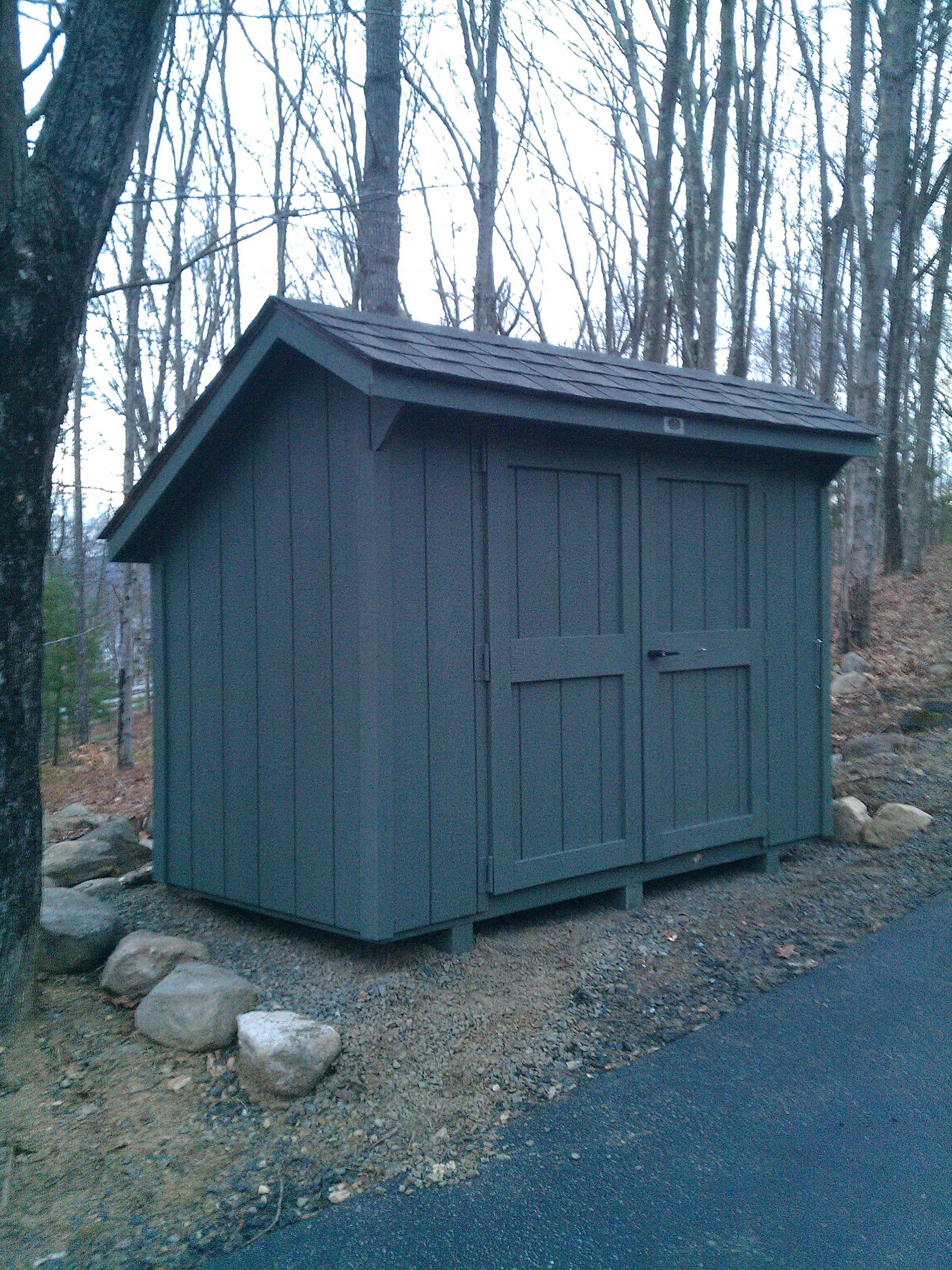 But now we have a tasteful New Englandy shed positioned just off the road behind a tree where it is hardly noticeable. It has a strong latch to foil all but the most determined of wildlife. (I’m not worried, most of our wildlife is pretty lazy actually.) I can drive garbage down anytime and only have to wheel the containers a few feet to the end of the drive. Oh Joy!