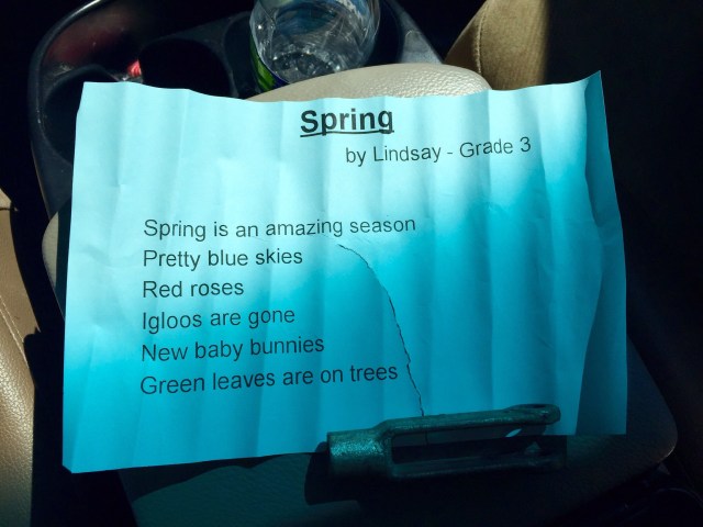I took a scroll and slipped it into my bag. When I finished my business, I returned to my car and got in. I took out the scrool and opened it up. It was a poem about Spring written by third grader Lindsay. A photo of the poem is below. I ripped it a bit trying to flaten it out.