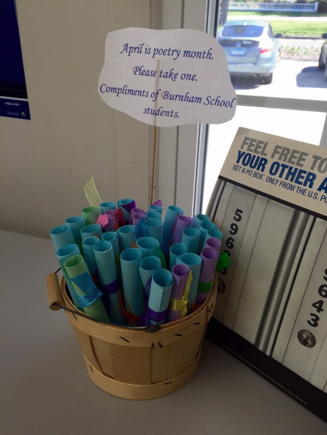 I went inside and stopped at the table in the P.O. box area to fill out the certified form. On the table was a basket filled with small scrolls of colored paper with a sign that read “April is poetry month. Please take one. Compliments of Burnham School Students”. Burnham School is the town’s elementary school and one of the best in the state.