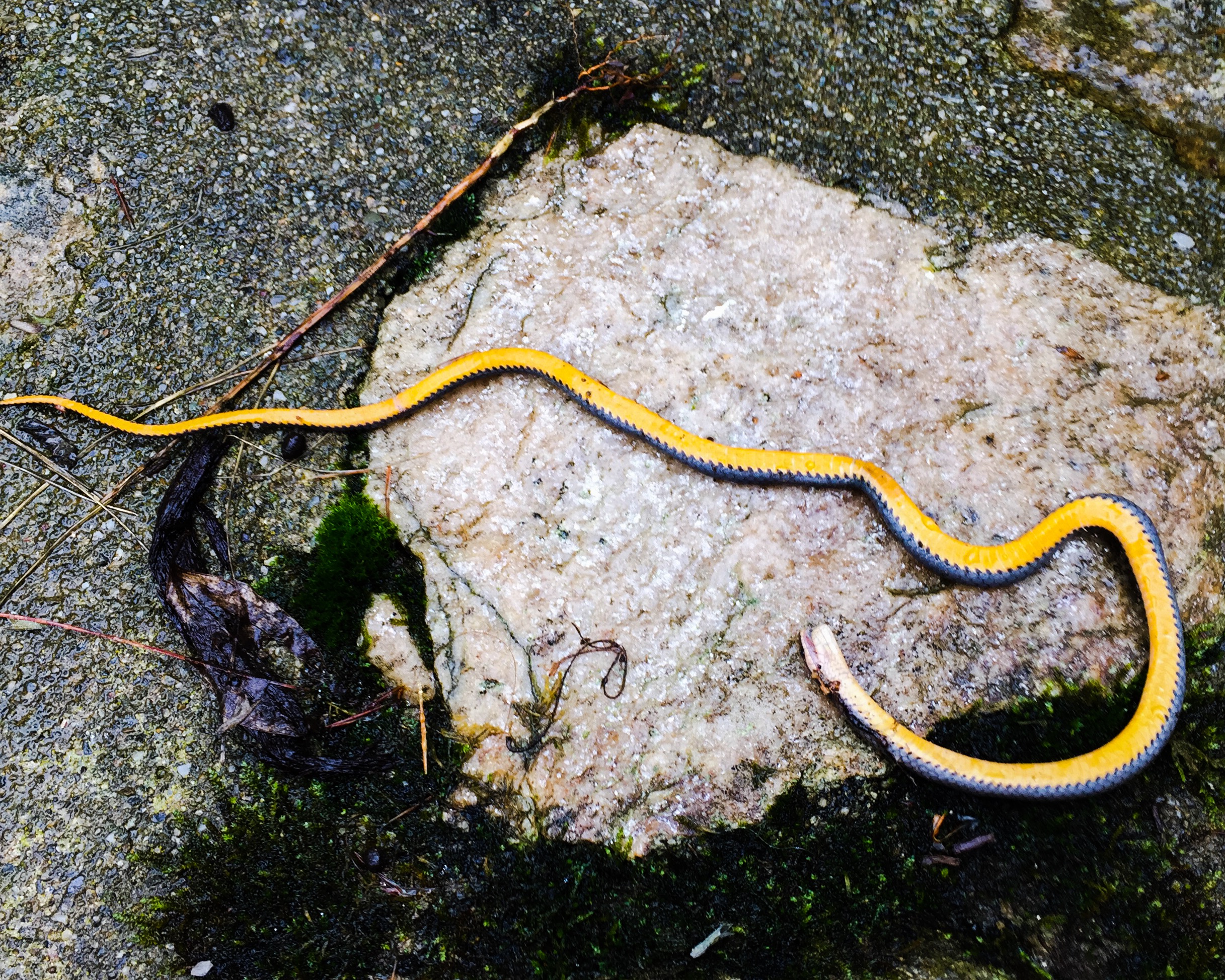 On Saturday, when we came back from dropping the dogs off at grooming, I noticed what I thought was biggest earth worm I had ever seen. When I looked a little closer, I saw that it was a ribbon snake. We have dozens of them living in our stone walls. They are usually very shy so I could tell right away that this one was dead. At another time in my life I would have been terrified and disgusted by a snake. I’m a city girl and snakes scared the crap out of me. But something in me has changed. I couldn’t leave it where it could be run over. I reached down picked it up and laid it on top of the stone wall. I looked at it closely and saw how beautiful it was; so graceful and delicate. It’s black scales shone like paten leather. I turned it over to see it’s lovely yellow belly. I felt a pang of sorrow that it was dead. In my head, I said a little prayer of thanksgiving that such a creature existed and I blessed it. Then I left it on the wall where a crow or raccoon would most likely find it.